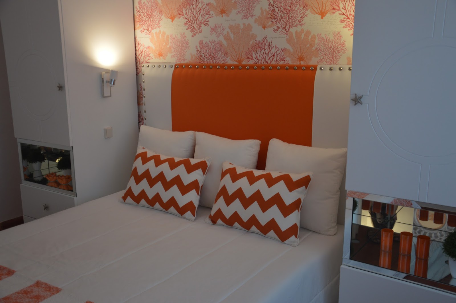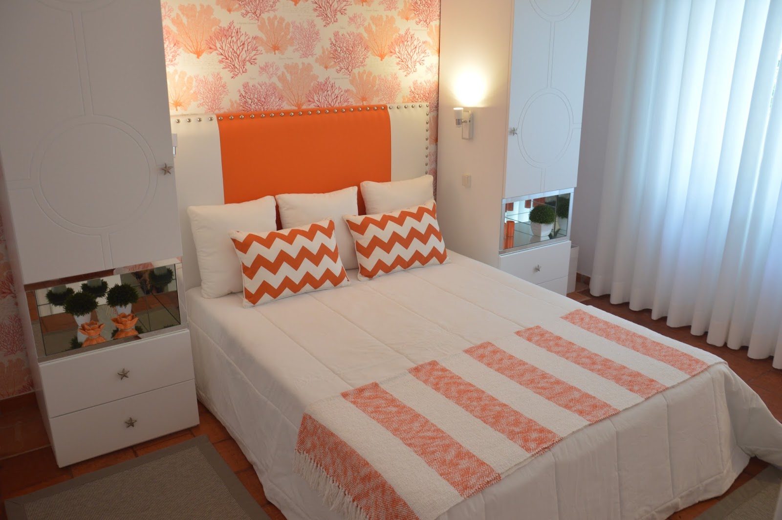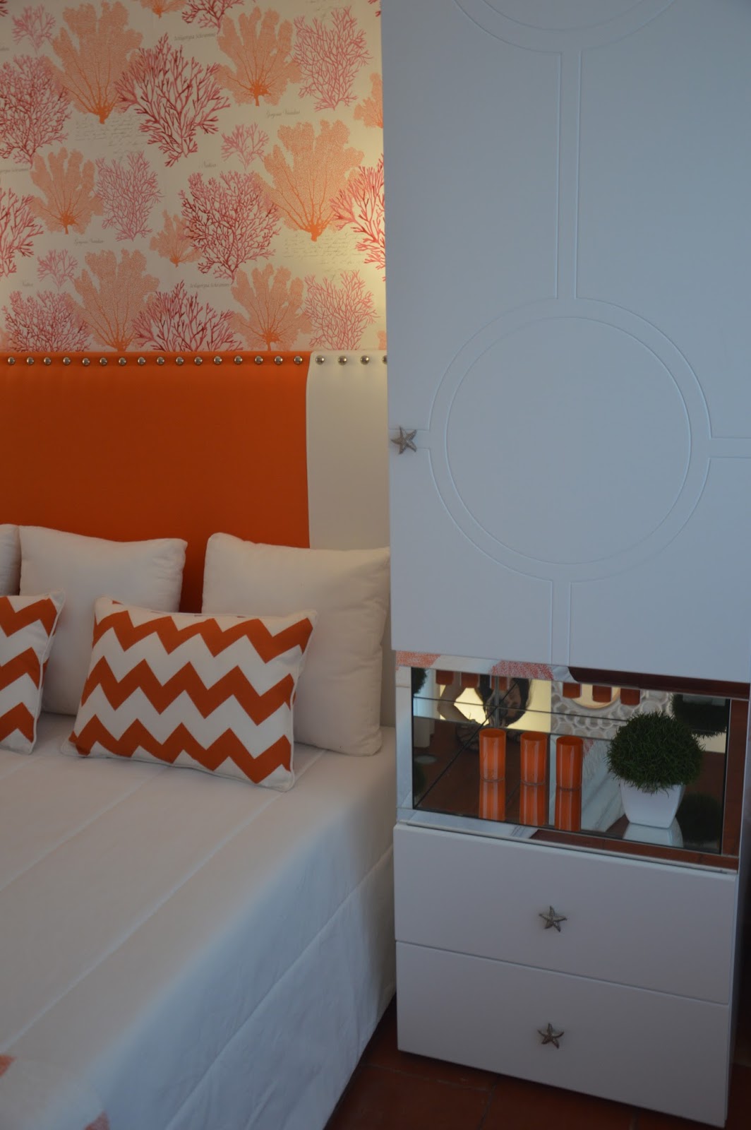 O papel de parede utilizado tem corais rosa e laranja, o que dá um ar bastante alegre ao quarto. Como o quarto só dispunha de um ponto de luz na zona da cabeceira de cama, optámos por colocar apliques nas laterais dos roupeiros.