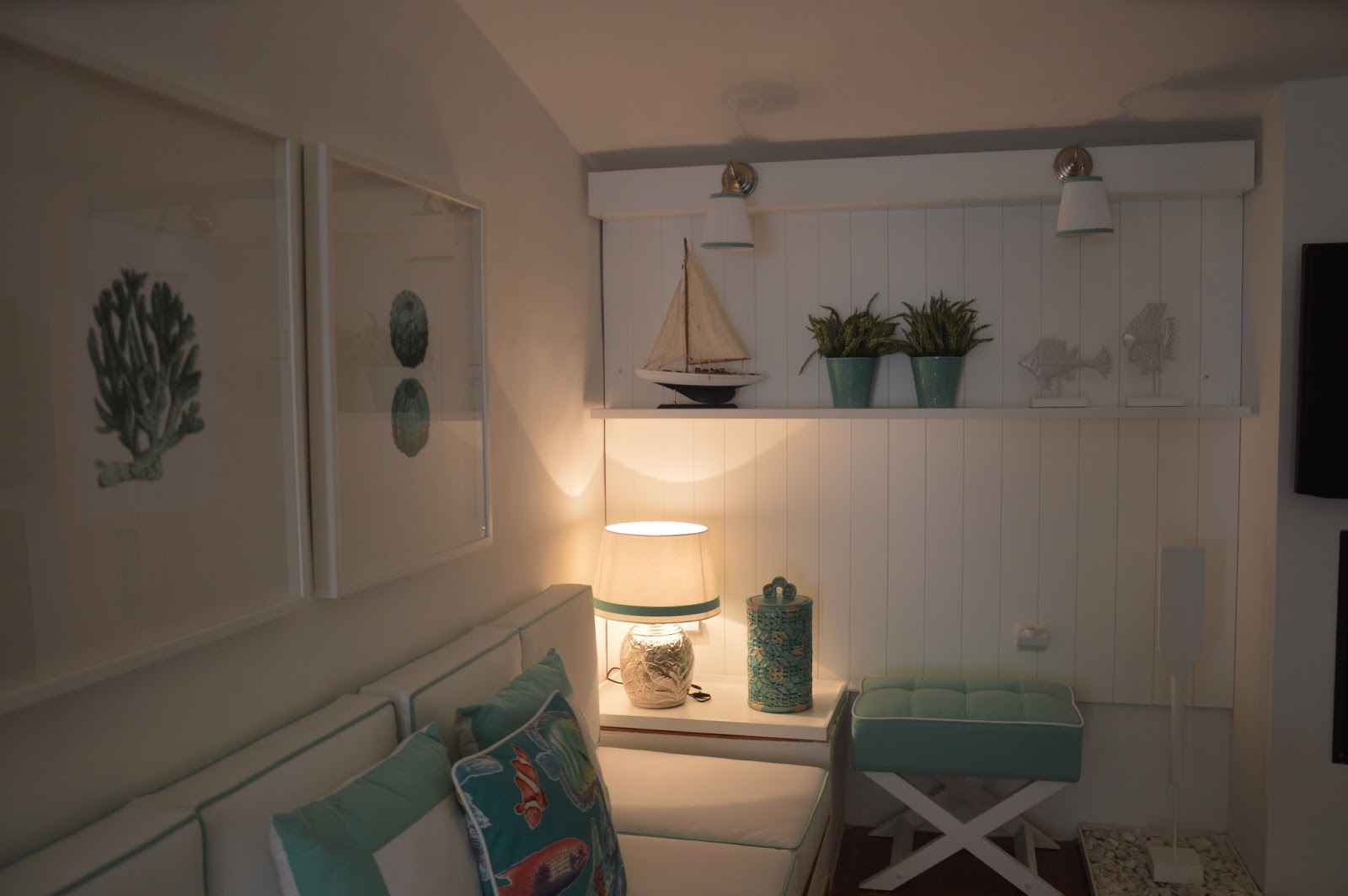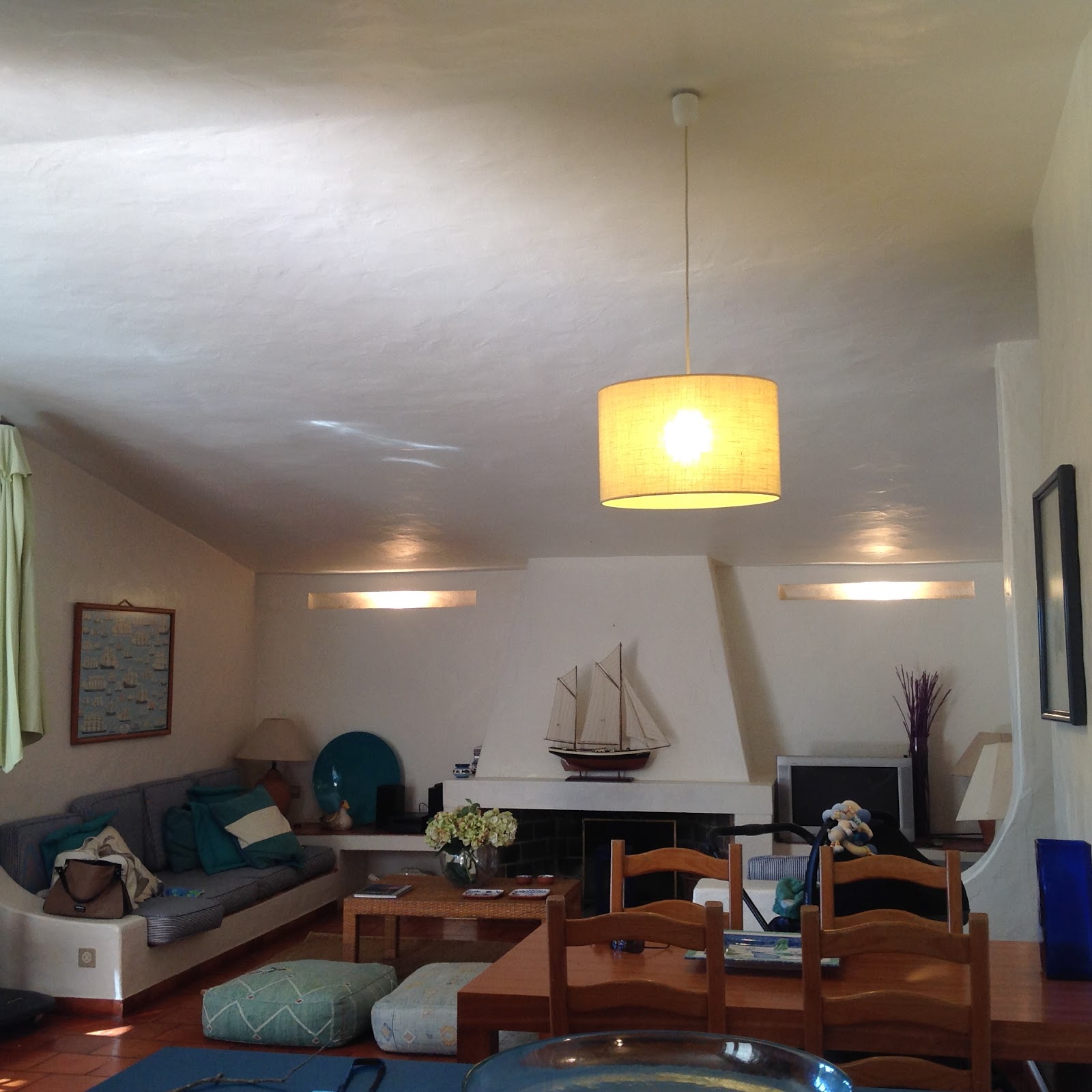 Esta vivenda tinha luz indirecta e, tal como fizemos nos quartos, puxámos pontos de luz. Aplicámos 4 apliques nas prateleiras superiores dos móveis e colocámos 2 candeeiros de mesa. A lareira em alvenaria era demasiado grande e por essa razão decidimos mandar construir uma de menores dimensões, recorrendo ao uso de pladour. A lareira ocupava demasiado espaço e a tv ficava cingida a um canto. Graças a Deus que a nossa Soniazinha em Luanda dizia "amém" a tudo o que decidíamos por cá.