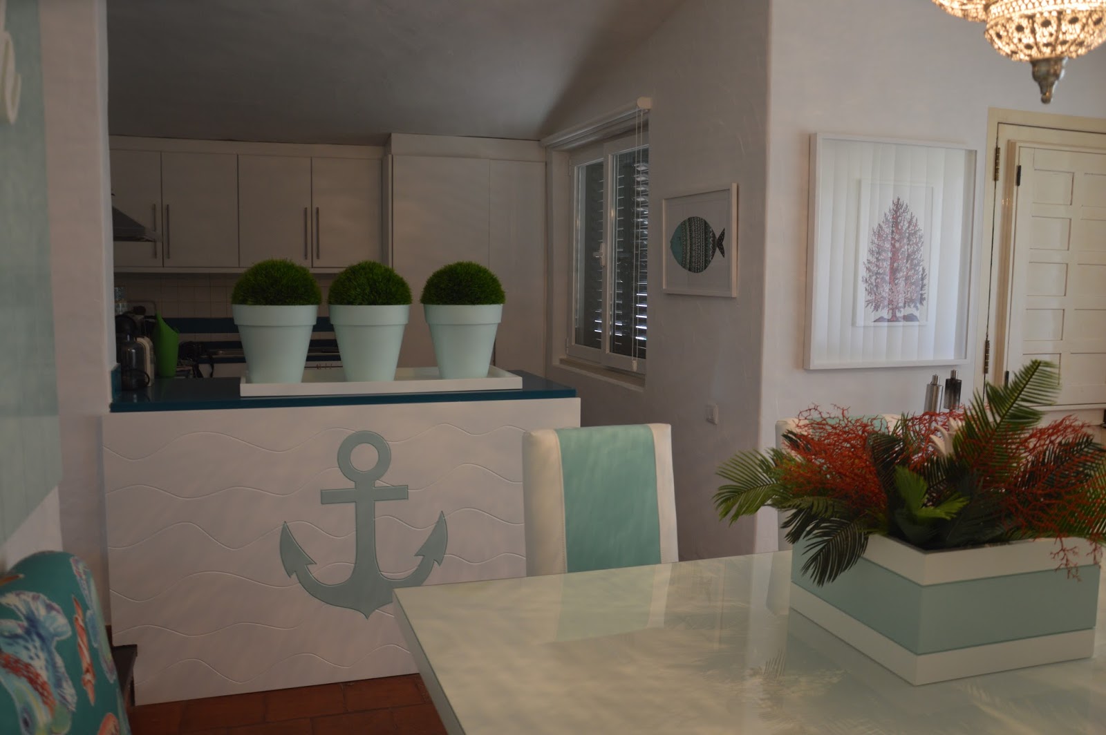 O balcão da cozinha era em alvenaria e como estava velho e demasiado rústico, decidimos revesti-lo com um painel lacado no qual mandámos encastrar o desenho de uma âncora.
